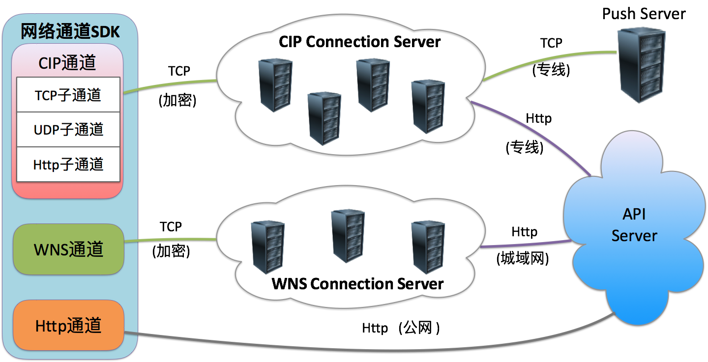 - CIP:即是自建的代理长连通道,长连通道支持TCP、UDP和HTTP子通道。HTTP子通道通过公网绕过长连服务器与业务服务器进行直接请求