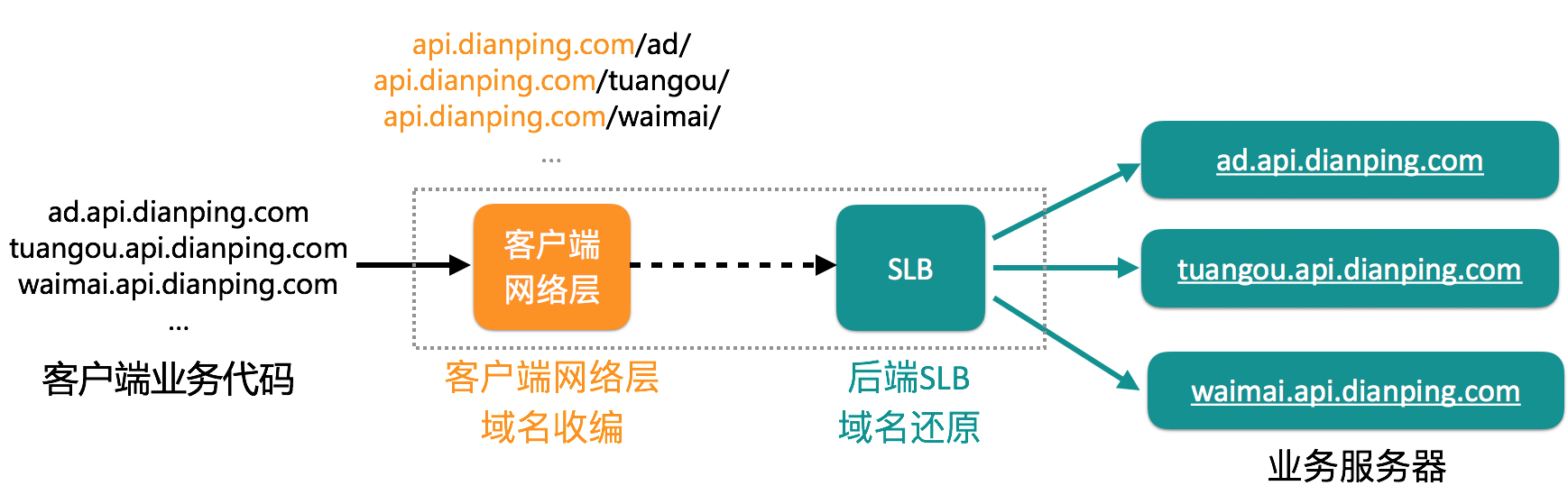 服务端进行还原:(还原后再去访问业务服务器) http://api.dianping.com/ad/command?param1=123 —> http://ad.api.dianping.com/command?param1=123