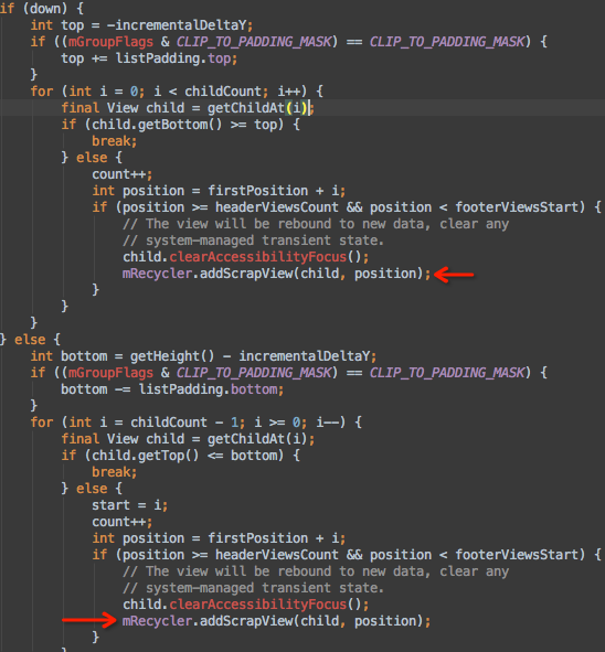- 下滑时,从上往下依次获取子view,如果子View的bottom值已经小于top值了,就说明这个子View已经移出屏幕了,所以会调用RecycleBin的addScrapView()方法将这个View加入到废弃缓存当中,并将count计数器加1,计数器用于记录有多少个子View被移出了屏幕;否则直接break;