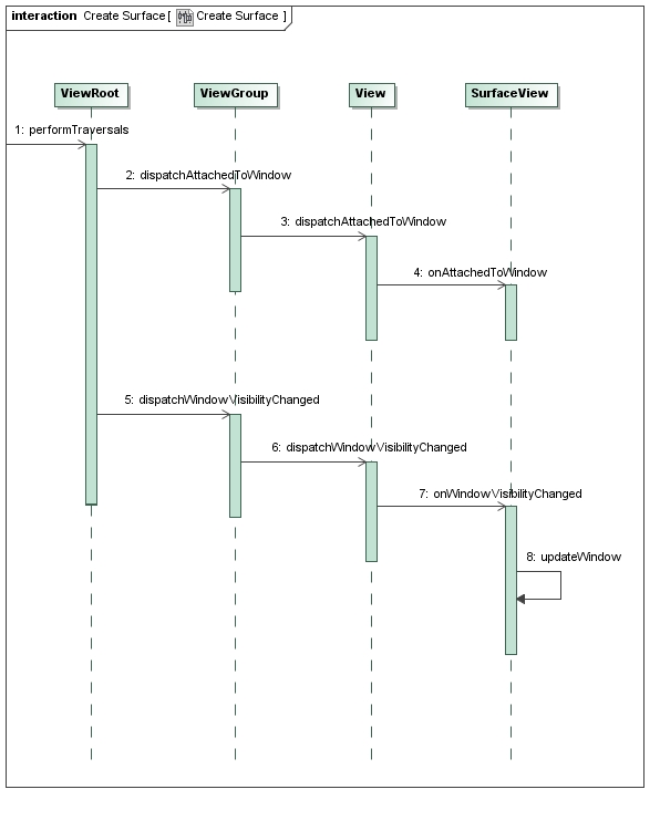 创建时从ViewRoot的performTraversals开始的,在窗口需要刷新UI,就会调用。如果发现没有当前窗口的绘制层还没有创建,或者已经失效了,则或请求WMS服务创建新的绘制图层,并且同时会给SurfaceView创建自己的绘制层。